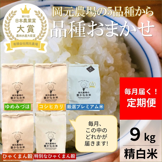 この商品は『定期便』です。 1ヶ月に1回のペースで、全6回のお届けとなります。 《定期便についてよくあるご質問と注意事項について》 Q.定期便とは? A.毎月1回、お米を定期的にお届けする商品です。一度注文すると、毎回注文する手間が省け、買い忘れの心配がありません。 Q.定期便の届くペースを教えてください。 A.1回目に注文をした日を基準とし、1ヶ月ペースでのお届けとなります。2回目以降は自動で注文が入り、4営業日以内に発送します。注文予定日の3日前に定期注文ご確認のメールをお送りします。 (例)1回目の注文日が10/15の場合 1回目注文 10/15 2回目注文 11/15 3回目注文 12/15 4回目注文 1/15 5回目注文 2/15 6回目注文 3/15 Q.定期便の発送日の変更はできますか? A.基本的に発送日の変更は承っておりません。ご了承くださいませ。 Q.次回の定期注文を1回スキップすることはできますか? A.はい、できます。ショップ側からしかスキップ処理ができませんので、発送予定日の3営業日前までにお問い合わせフォームよりご連絡ください。 どうぞご理解のうえ、定期便をご利用いただきますよう何卒よろしくお願いします。 **************************************** 【令和7年産品種おまかせ定期便】 岡元農場の5品種から毎月1品種おまかせでお届けします。 毎月違う品種を食べて、それぞれの違いを楽しんでみてください♪ 【令和7年産お届け予定スケジュール】 1回目 ゆめみづほ 2回目 コシヒカリ 3回目 厳選プレミアム米 4回目 ひゃくまん穀 5回目 特別なひゃくまん穀 6回目 コシヒカリ ※品種は変更となる場合がございます。ご了承ください。 ●日本農業賞大賞を受賞しました● 岡元農場は2022年に第51回日本農業賞大賞を受賞しました。 日本農業賞とは、「NHK」と「JA全中」、「JA都道府県中央会」が主催して、日本農業の確立をめざし、意欲的に経営や技術の改革にとりくみ、地域社会の発展にも貢献している農業者と営農集団が表彰されます。 その日本農業賞において、最優秀の証である大賞を受賞しました。 これは長い間、岡元農場を支えてくださっている地主様、お客様、地域の皆様のおかげです。 ●岡元農場とは石川県能美市でお米と加賀丸いもを生産している農家です● 岡元農場のスローガン【Nice Rice de Smile! ~おいしいごはんで笑顔に~】 私たち岡元農場は日本や地域の水田・自然・環境を守るという事はもちろんですが、お客様に当たり前に安心して美味しいお米を召し上がっていただきたいから、本気で米づくりに励んでいます。 農家なので、生産~収穫~販売までを一貫して行っています。 そのため、【農家直送】で高品質のお米を自信をもってお送りいたします。 加賀丸いもはやまのいも(とろろ)で地域の特産農産物であり、農林水産省の「GI認証」も取得しております。 ●お米の保管について● お米の到着後はなるべく15℃以下の冷蔵庫等での保管をお勧めいたします。 高温多湿を避けて、冷暗所で保存してください。 保存場所としては冷蔵庫が最適で、入らない場合は日の当たらない冷暗所で保存してください。 直射日光が当たる部屋や、高温になる部屋などは虫発生の原因になりますのでおやめください。 お米には消費期限はありませんが、長期保存を行うと品質の劣化や虫が発生する場合がありますので、なるべく早くお召し上がりください。 ※ご購入前に必ずご確認ください※ ・製造ラインの仕様上、まれに茶色の米ぬかのかたまりが混入する可能性がございます。 ・こちらの商品は定期便となります。 ・画像はイメージです。 ・パッケージは、かわることがあります。 ・発送梱包は、環境に配慮し簡易包装に努めております。予めご了承ください。 ・食品のため、返品・交換については基本的に不可となります。 ・商品に不都合がございましたら、商品到着後3日以内にご連絡をお願いします。