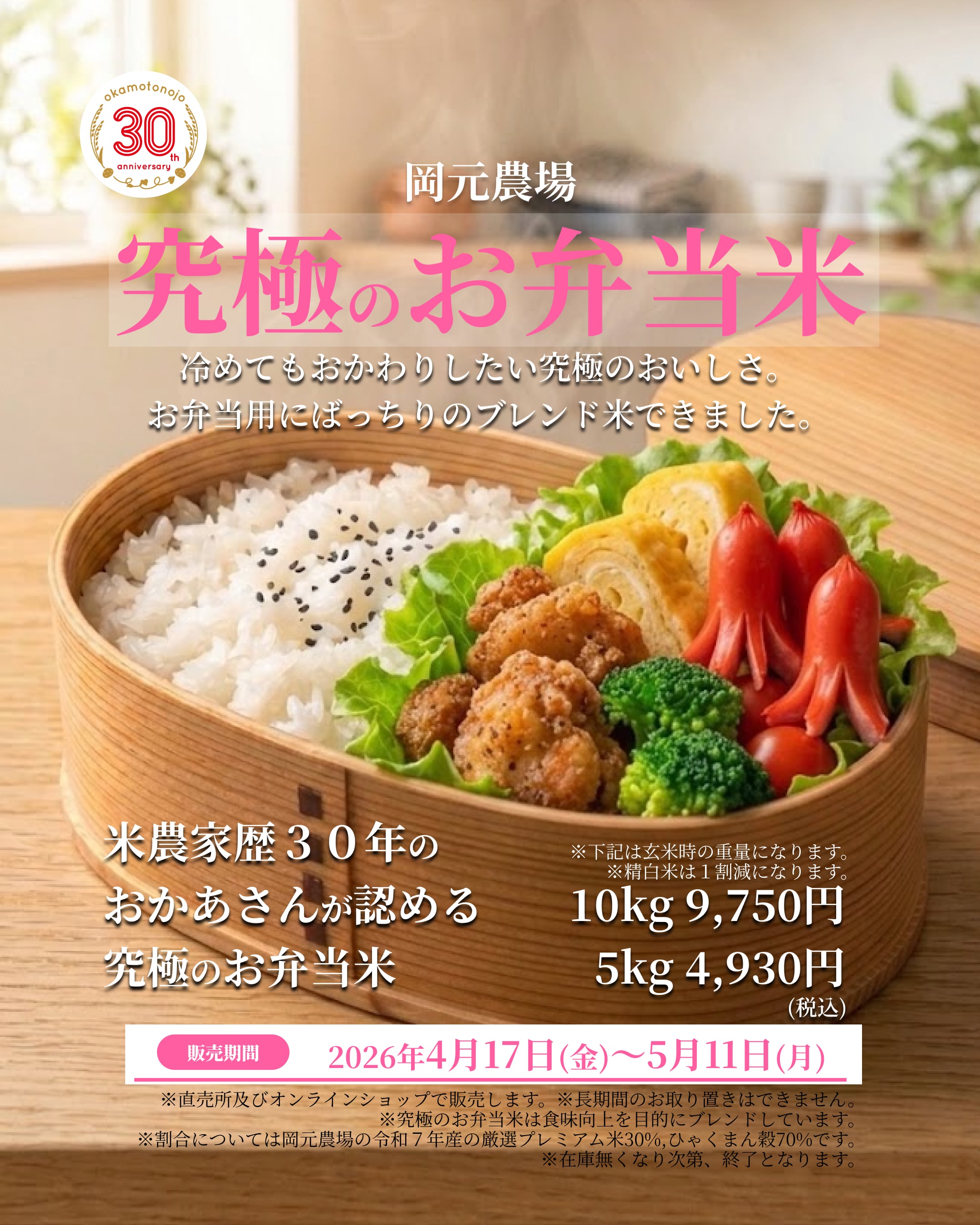 ※割合については岡元農場の令和7年産の厳選プレミアム米30%,ひゃくまん穀70%です。