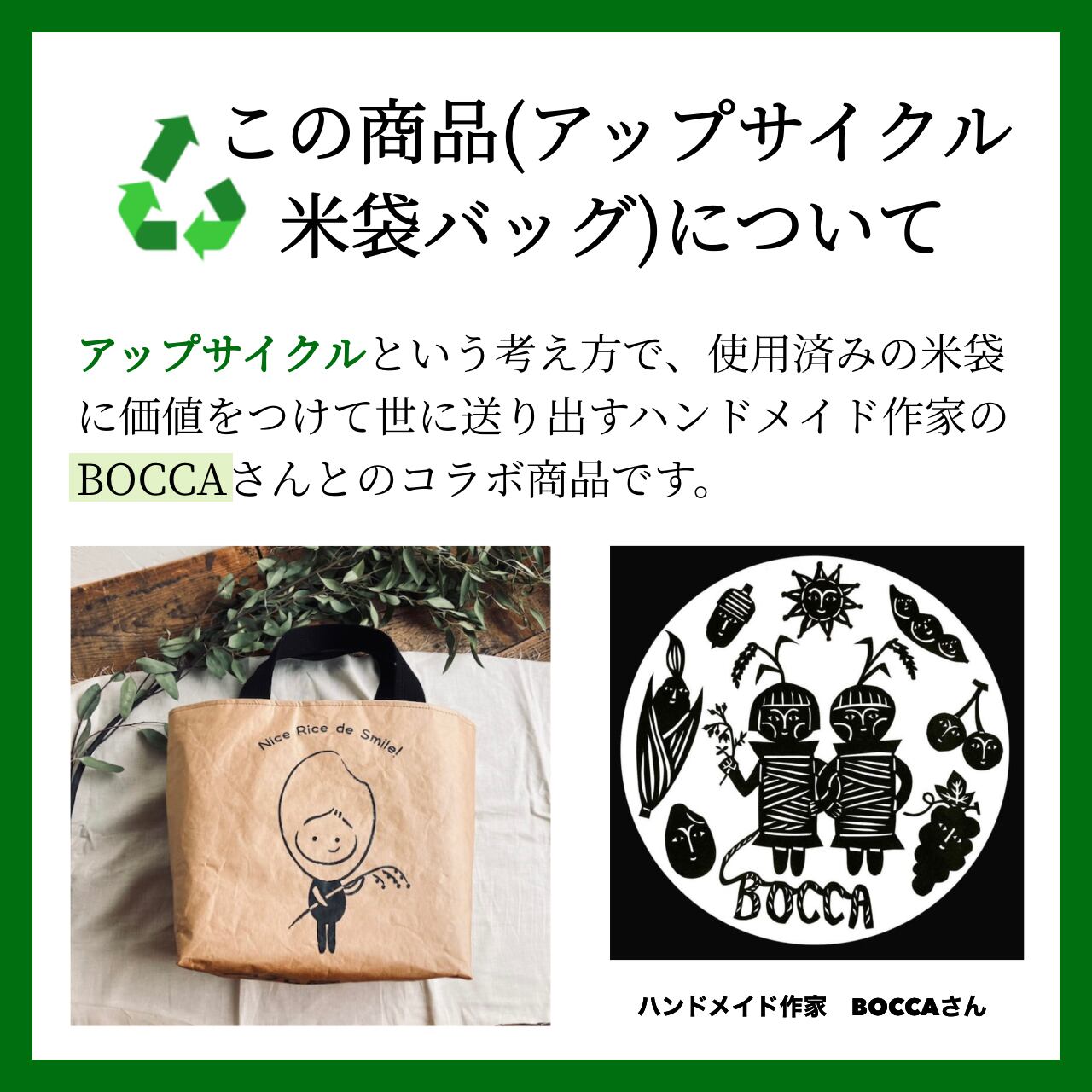 このバッグは、アップサイクルという考え方で使用済みの米袋に新たな価値をつけて世に送り出すハンドメイド作家のbocca(ボッカ)さんとコラボし、使い終わった米袋をバッグに加工した商品です。